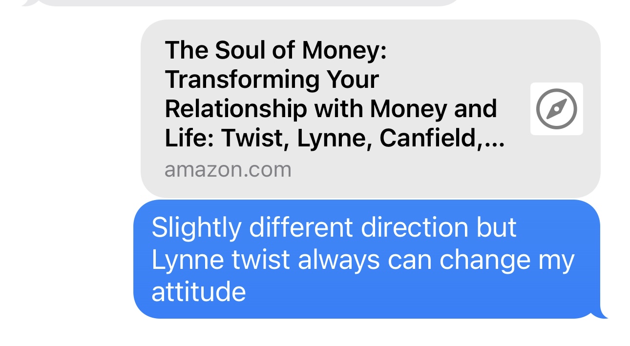 “Slightly different direction, but anything Lynne Twist can always change my attitude.” I followed up with including a link to the Soul of Money.